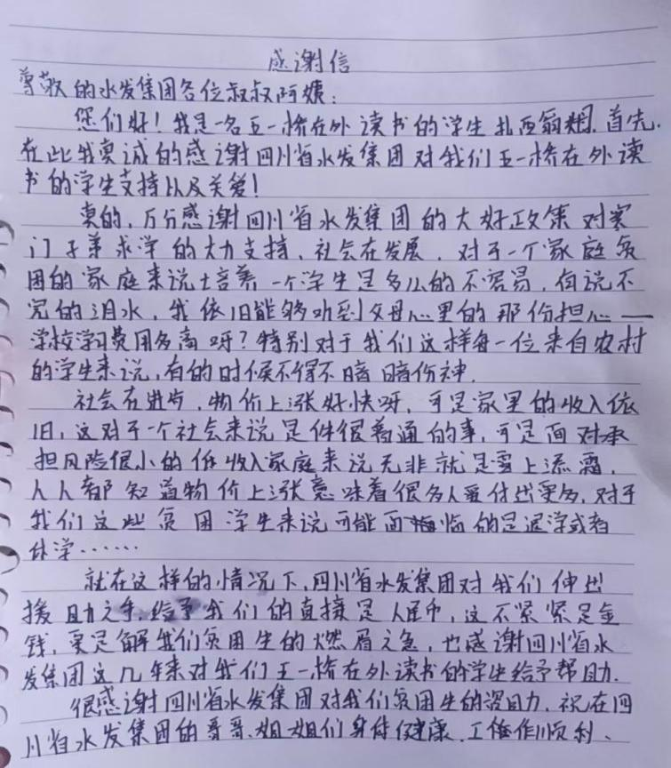 按照省委托底性幫扶戰略部署,在水利廳的領導下,集團認真履行省屬國企社會責任,立足企業實際,將集團優勢與德格縣資源稟賦充分結合,加快推進德格縣托底性幫扶、振興發展工作取得實效。為更好地助力集團對德格縣的托底幫扶工作,集團團委于2022年以來按年度實施開展了“滴灌育苗”助學幫扶活動,截至目前,累計向德格縣更慶鎮五一橋村捐贈助學幫扶金3.48萬元,幫助青少年學生48人次順利入學,受助學生也對集團“滴灌育苗”助學幫扶計劃心存感激,紛紛發來感謝信。