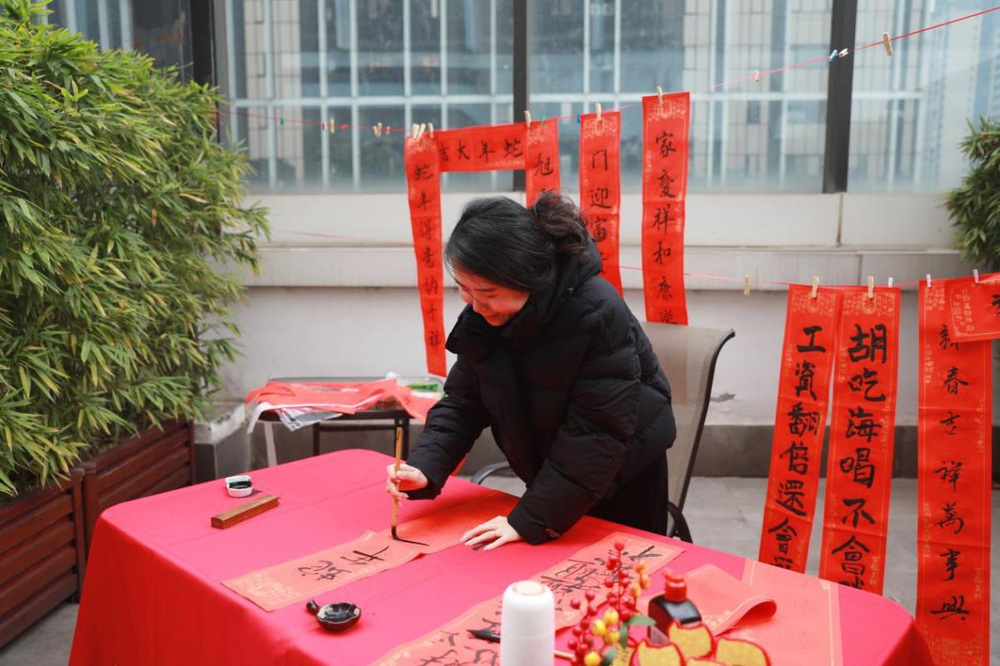 “迎春寫對聯”隨著職工書寫的鋪氈、蘸墨、揮毫,筆鋒一起一落,一幅幅對仗工整、寓意吉祥的春聯躍然紙上。